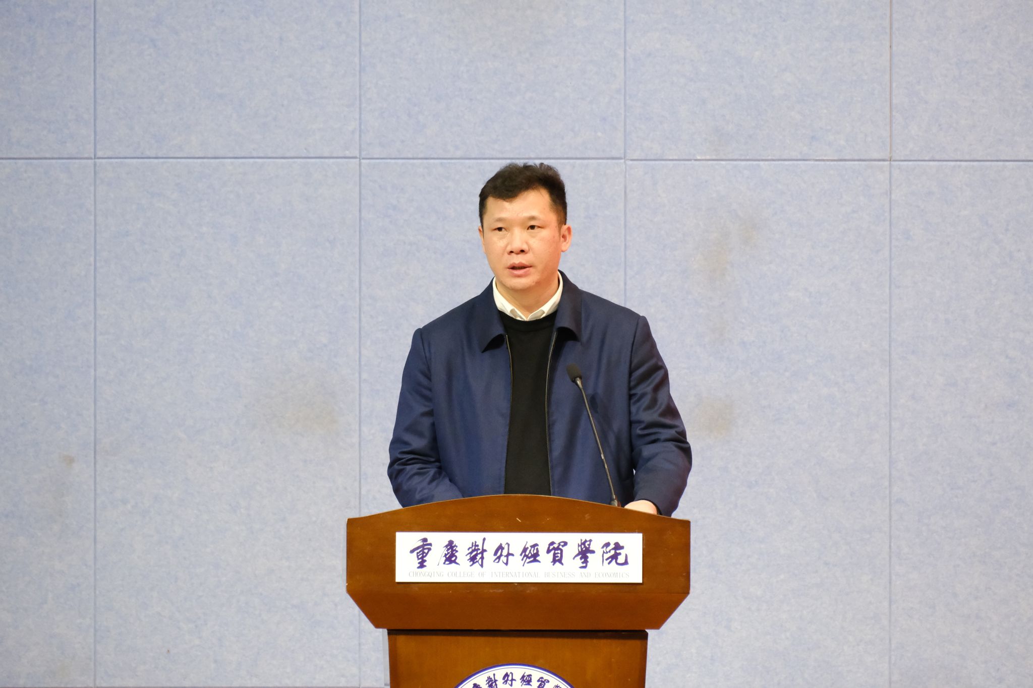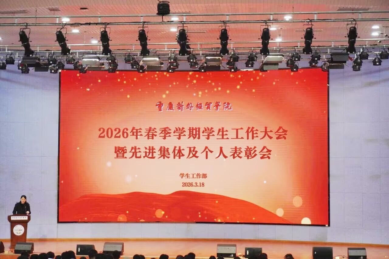3月18日,重庆对外经贸学院2026年春季学期学生工作大会在合川A校区9101报告厅召开。副校长李川出席会议并讲话,学生处处长/学生就业与创新创业中心主任伍祥伦、团委副书记(主持工作)冯斯迪、各学院党总支书记(副书记)及全体学工人员参加会议。会议由学生处副处长汪嫔嫔主持。